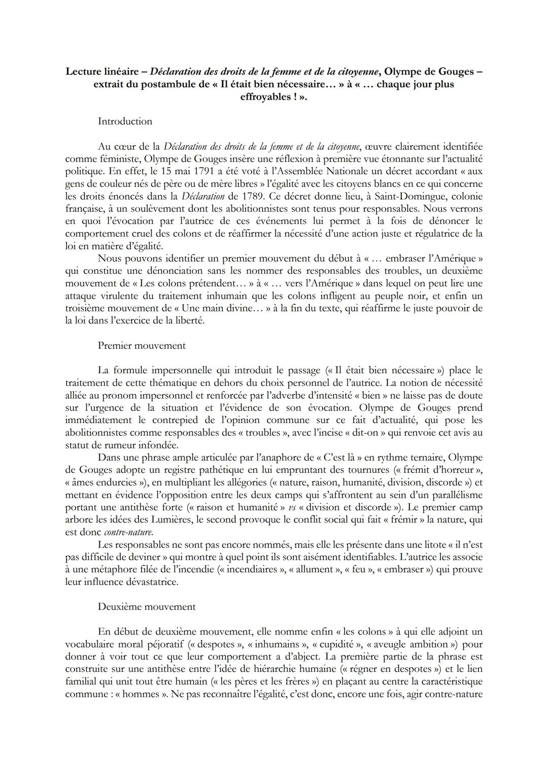 analyse linéaire – Déclaration des droits de la femme et de la citoyenne, Olympe de Gouges – extrait du postambule de « Il était bien nécessaire... » à « ... chaque jour plus effroyables ! »