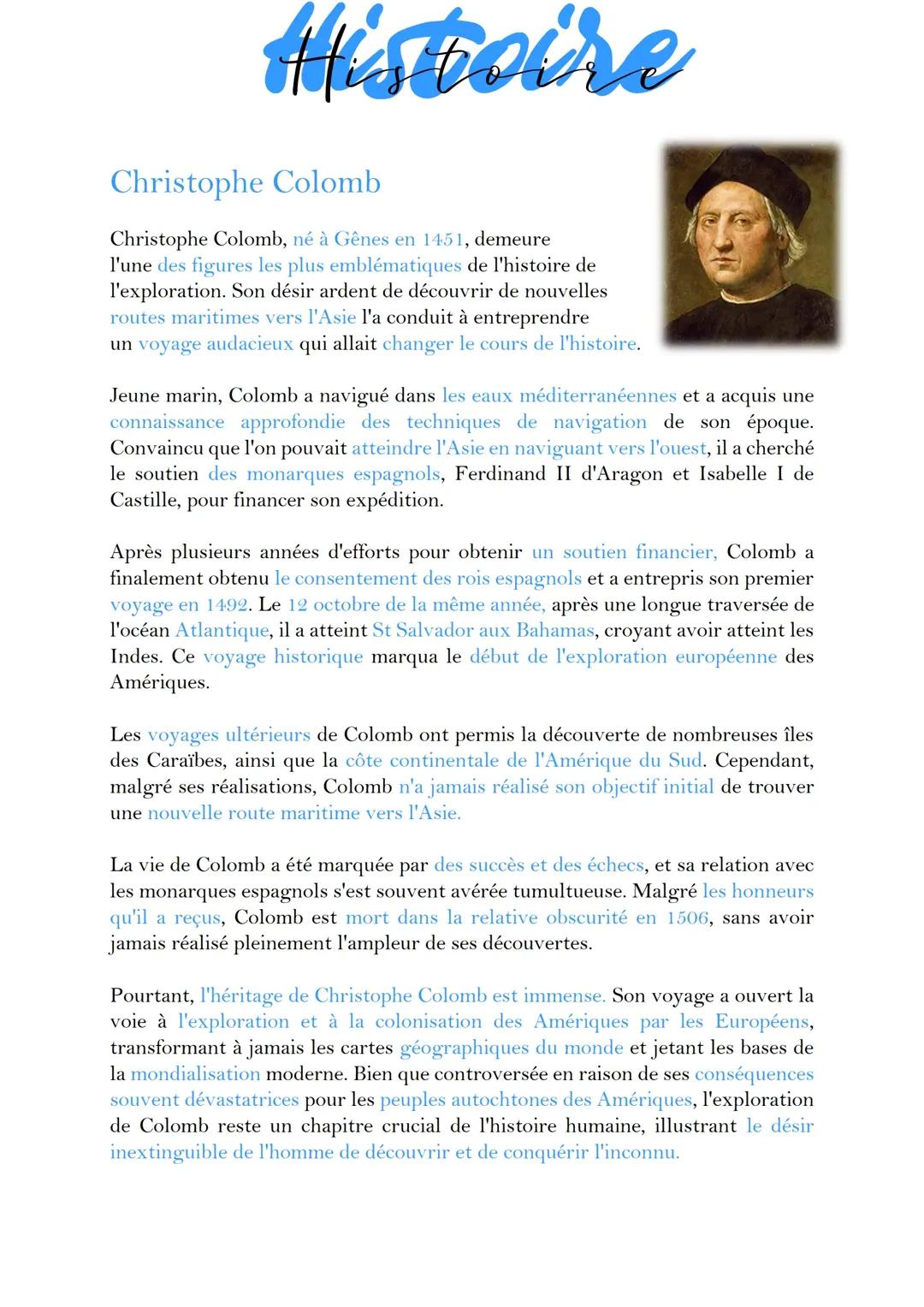 Cette fiche de révision est une courte biographie de la vie de l'explorateur Christophe Colomb. Bonnes Révisions à tous et à toutes !
